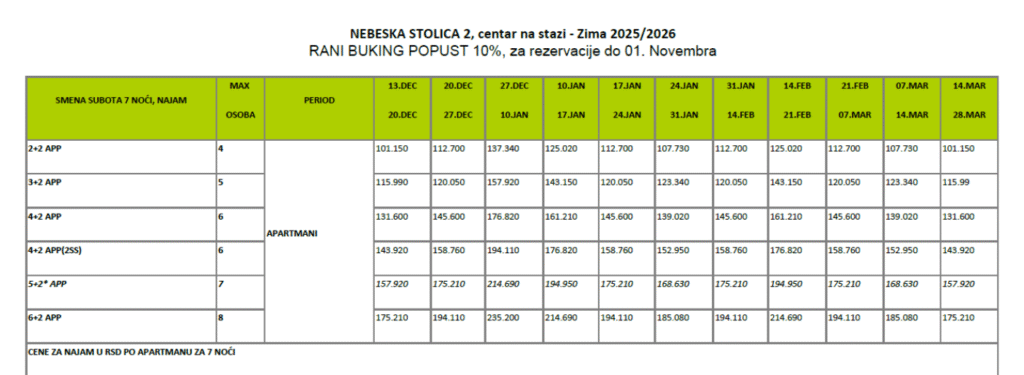 Popust od 10% za rane rezervacije do 01.11.2025. godine važi za uplate od 50% pri rezervaciji i 50% do 15.12.2025. godine.