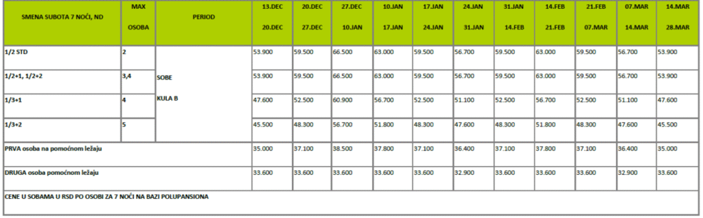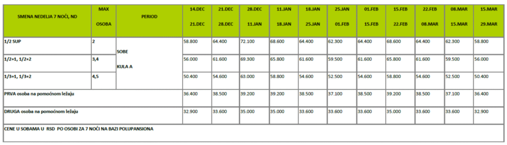Doplata za uslugu polupansiona (doručak I večera) je OBAVEZNA. 3.000 rsd dnevno po osobi, deca do 1.99 god besplatno, deca 2-9.99 god plaćaju 50%;